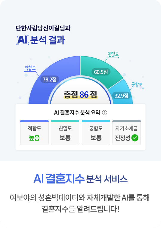 평생 함께 할 사람이니 나이.학력.재산보다는 대화를 더 중요하게 생각했는데 딱 제가 찾는 분을 만났어요. 찾을 때 까지 기다린 보람이 있었네요 대화가 통하는 사람을 만나고 싶었어요. 많은 분들과 대화를 나누면서 기다리고 기다렸어요. 찾으니 찾을 수 있더라구요